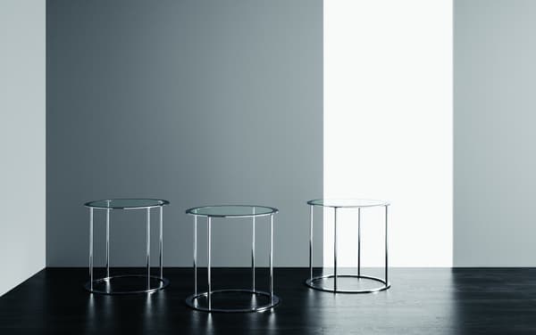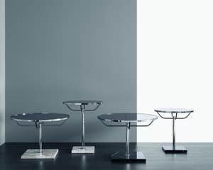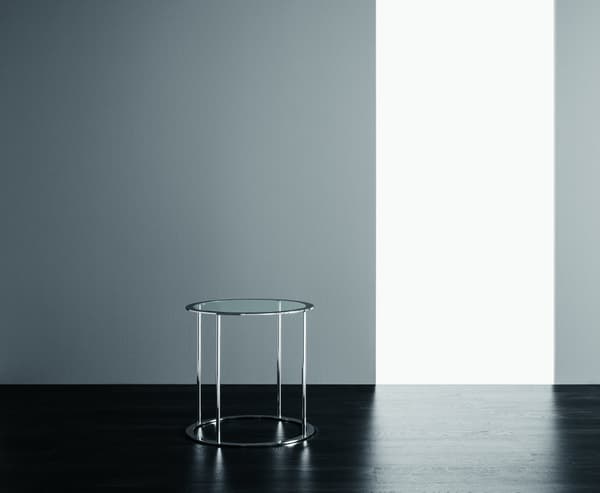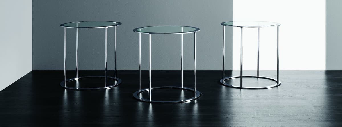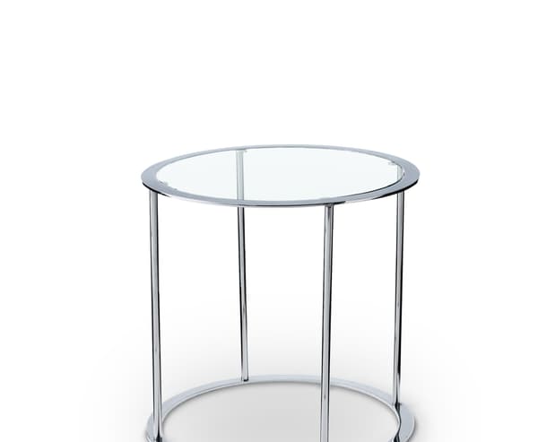 Une table ronde classique en chrome avec plateau en verre.