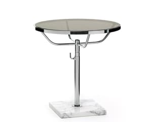 Une table ronde classique en chrome, avec réglage manuel de la hauteur et piètement en marbre.